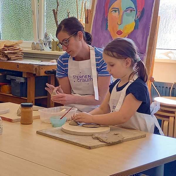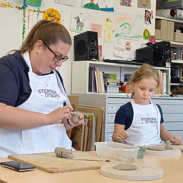 Am Samstag durfte Lukas mit seiner Mutter dabei sein. Lukas war sehr aufgeregt als er in den großen, bunten, liebevoll dekorierten Raum von Monika kam. Er freute sich sehr über unsere Sternentraum Schürze, die wir gleich zum Tonen für unser erstes Kunstwerk anzogen. Es war gar nicht so einfach diese Kugel aus Ton in die richtige Form zu bringen. Aber Lukas war konzentriert dabei und ihm gefielen besonders die Muster, die er kunstvoll in die Schale zeichnete.