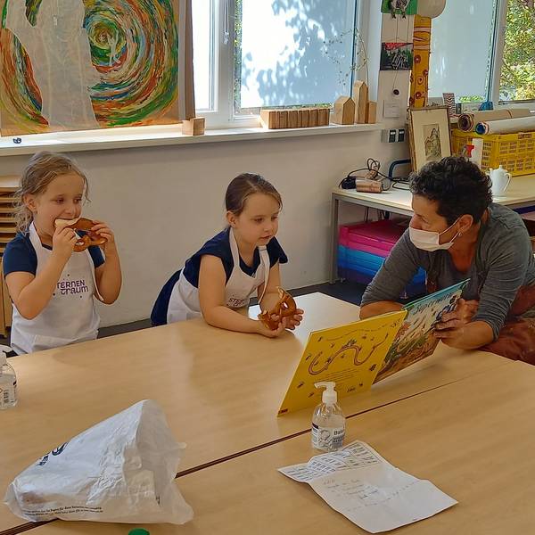 Eine Mama mit Sohn und Tochter arbeiteten zum ersten Mal mit Ton und waren ganz fasziniert, die Mama töpferte einen Krug und bekamen in der Pause, wie alle anderen ein schönes Bilderbuch vorgelesen.