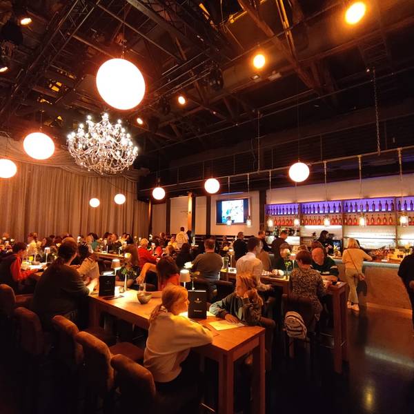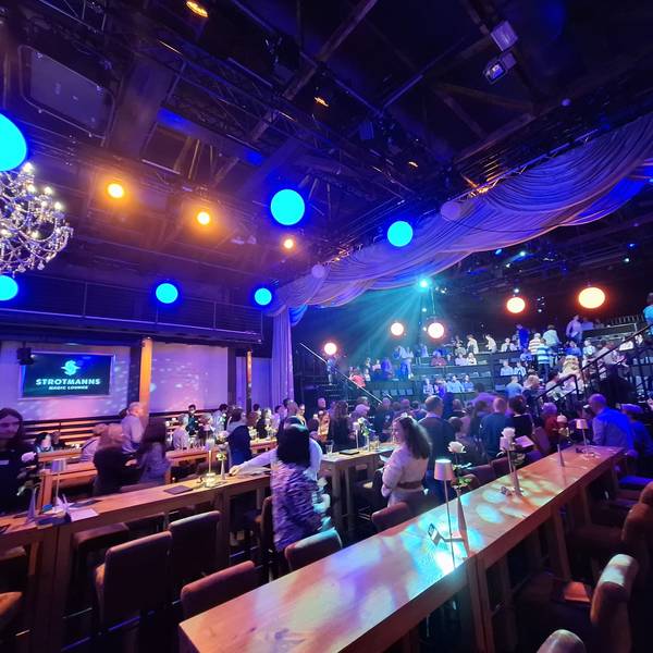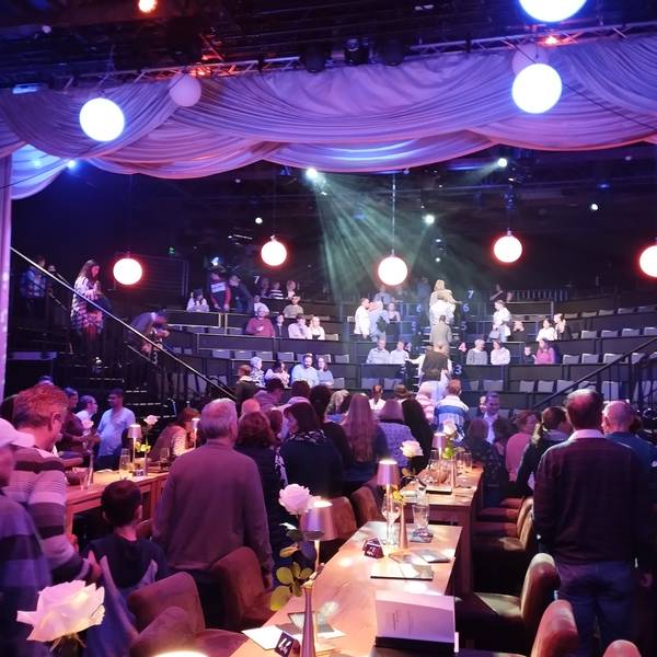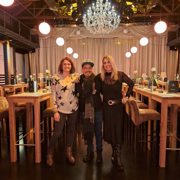 Der Abend begann in entspannter Atmosphäre mit leckerem Fingerfood von L-Catering aus Esslingen und passenden Drinks. Dann wurde es spannend, alle Lampen begannen sich über den Köpfen zu bewegen und das Staunen war groß, als der Vorhang zum eigentlichen Theaterraum fiel.