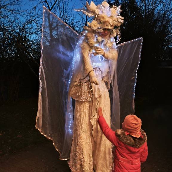 Der Höhepunkt des Abends war die LED-Stelzenkünstlerin “Lux Aeterna“, die als riesengroßer Lichterengel Glücksglöckchen an die Kinder verteilte und durch die Menge ‘stelzte’. 🤩🤩🤩 Fasziniert ließen sich die Familien gerne mit ihr fotografieren. Mit einer atemberaubenden Feuerschau zog sie zum Ende nochmal alle Besucher in ihren Bann.