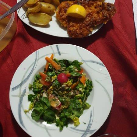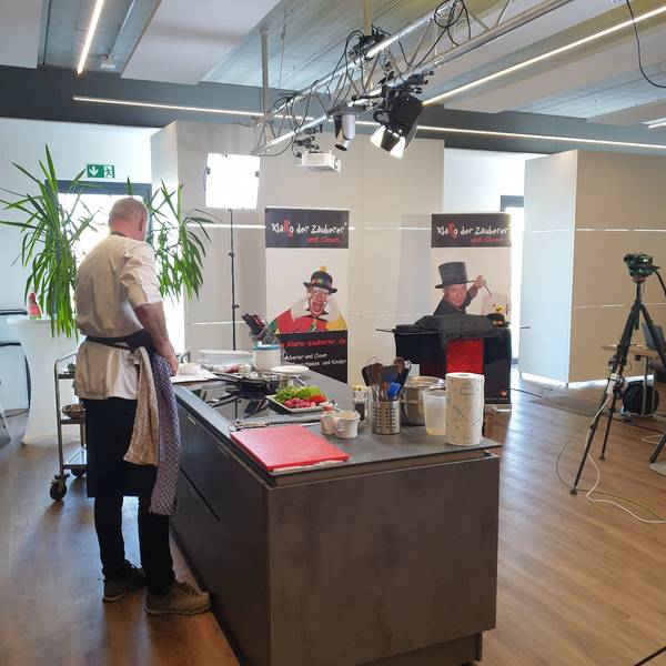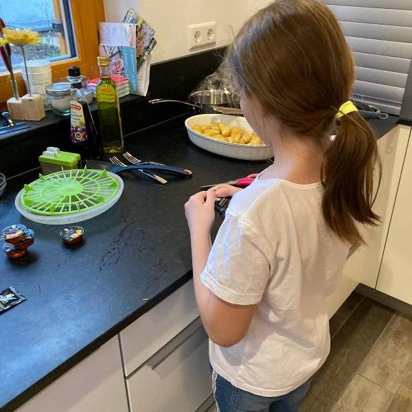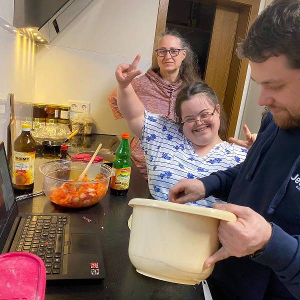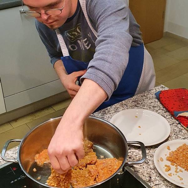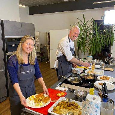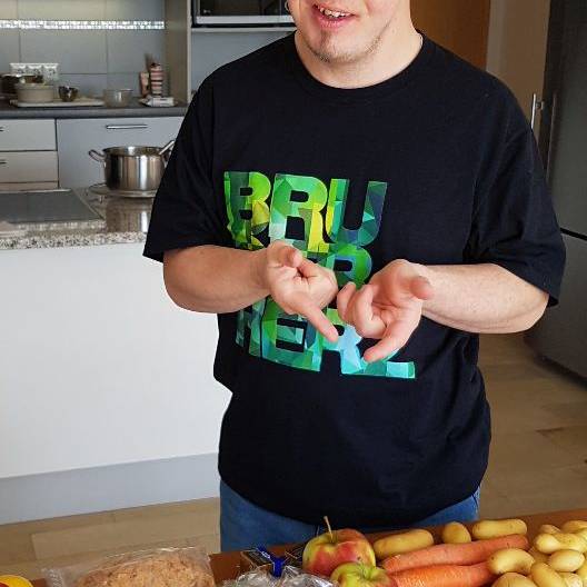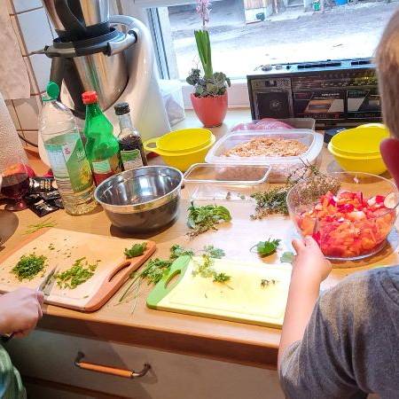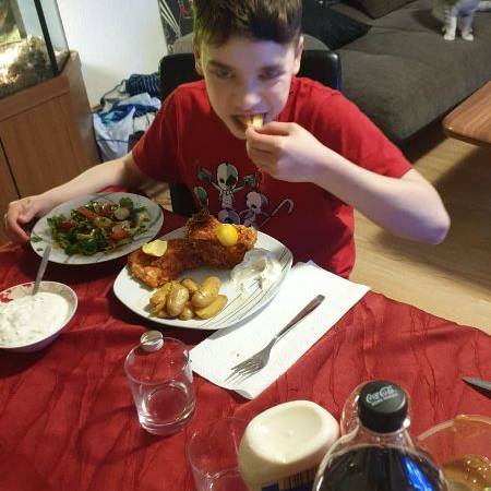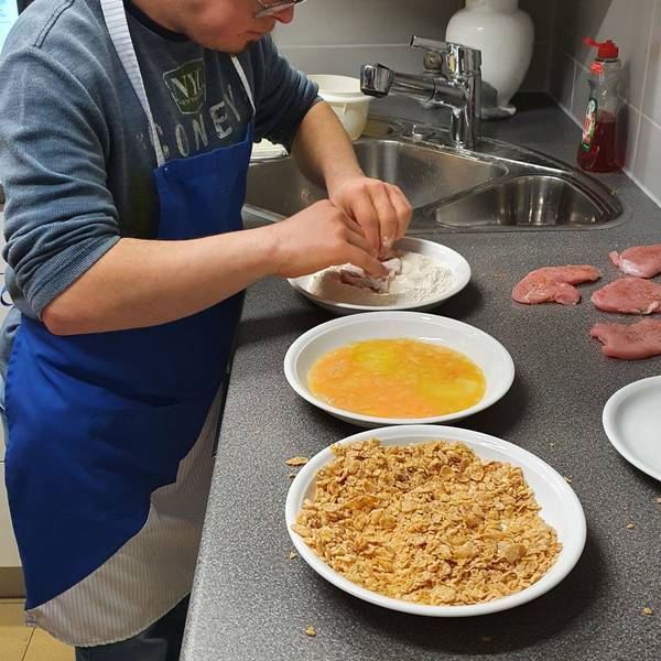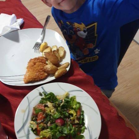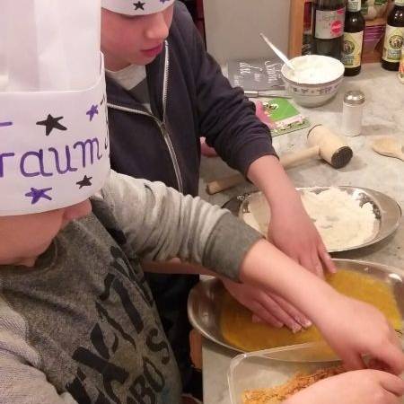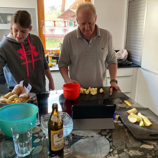 Nach einer kurzen Begrüßung von Koch Udo, Vorstand Tobias Wolf und Wunscherfüllerin Gabi Feihl konnte es auch schon losgehen. Vorstand Tobias Wolf und Wunscherfüllerin Gabi Feihl kochten vor Ort mit. Nun wurde geschnippelt, gerührt und geknetet. Schritt für Schritt wurde alles genau erklärt und stellte jemand eine Frage in den Chat, dann wurde es von Udo Grabl sofort erklärt. Dann wurde es auf einmal ganz laut…Udo erklärte, wie man ein Schnitzel richtig klopft. Fast gleichzeitig auf Kommando klopften alle los. Einige mussten sich sogar die Ohren zuhalten. Das war ein Lärm! Und ganz schön anstrengend. Beim Arbeiten wird man hungrig so heißt es ja…und Kochen ist auch Arbeit! Die Vorspeise, ein leckerer Rohkostsalat mit selbstgemachtem Senfdressing, schmeckte richtig lecker.