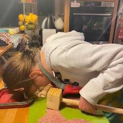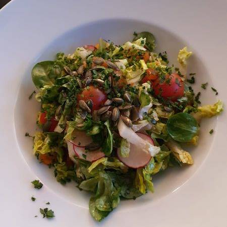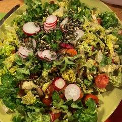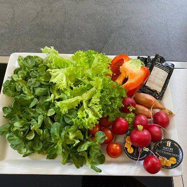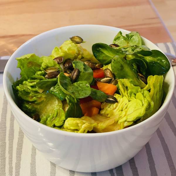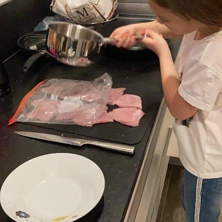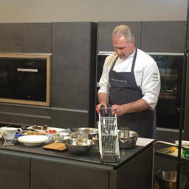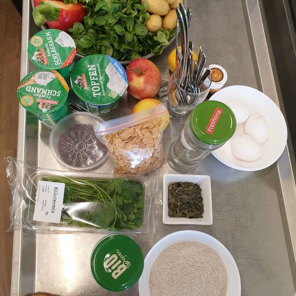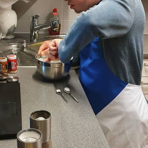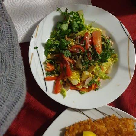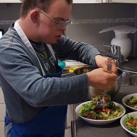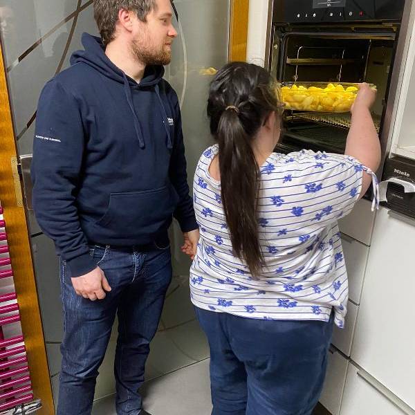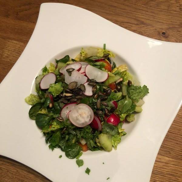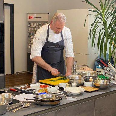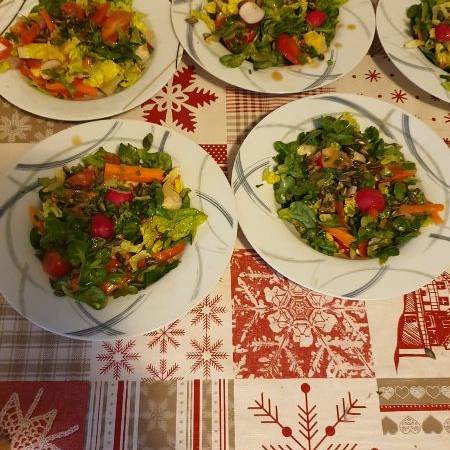 Nach einer kurzen Begrüßung von Koch Udo, Vorstand Tobias Wolf und Wunscherfüllerin Gabi Feihl konnte es auch schon losgehen. Vorstand Tobias Wolf und Wunscherfüllerin Gabi Feihl kochten vor Ort mit. Nun wurde geschnippelt, gerührt und geknetet. Schritt für Schritt wurde alles genau erklärt und stellte jemand eine Frage in den Chat, dann wurde es von Udo Grabl sofort erklärt. Dann wurde es auf einmal ganz laut…Udo erklärte, wie man ein Schnitzel richtig klopft. Fast gleichzeitig auf Kommando klopften alle los. Einige mussten sich sogar die Ohren zuhalten. Das war ein Lärm! Und ganz schön anstrengend. Beim Arbeiten wird man hungrig so heißt es ja…und Kochen ist auch Arbeit! Die Vorspeise, ein leckerer Rohkostsalat mit selbstgemachtem Senfdressing, schmeckte richtig lecker.