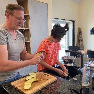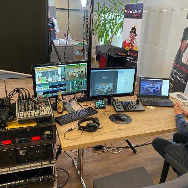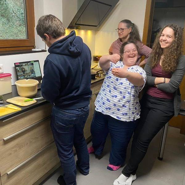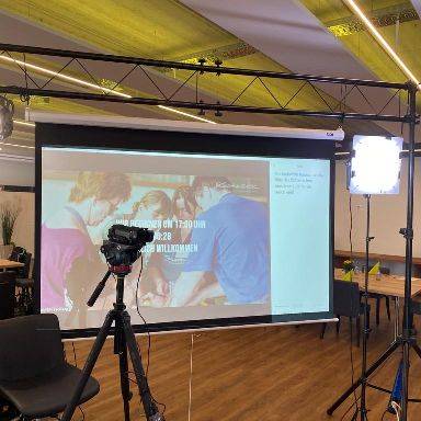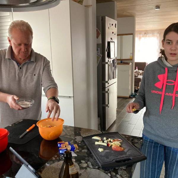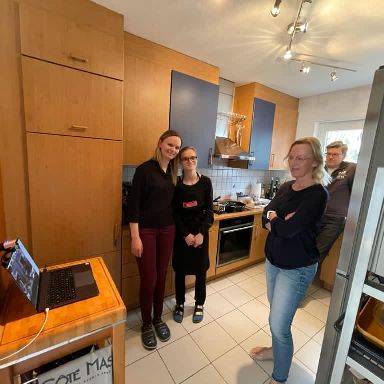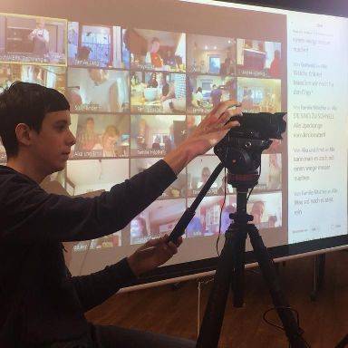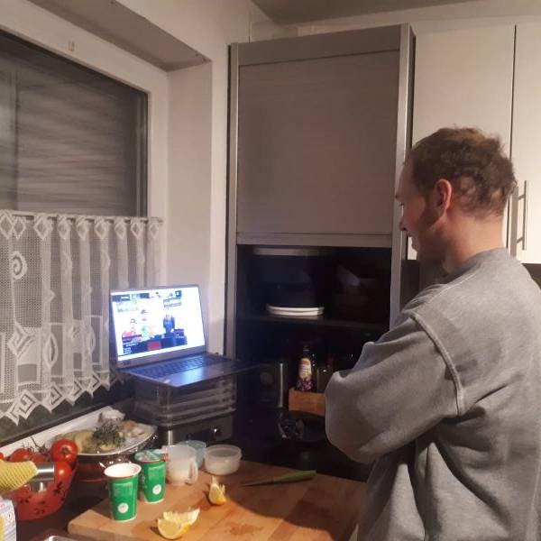 Wie bringen wir alle Kochpakete rechtzeitig am Samstag zu den Familien? Nur durch die tolle Unterstützung der Ehrenamtlichen konnten wirklich alle Essenspakete ausgeliefert werden! Vielen Dank! Jürgen Manhalter erarbeitete einen Plan für den Botendienst und am Samstag standen alle zum Ausfahren eingeteilten Helfer pünktlich für den Ausfahrdienst bereit. Ihr seid spitze! Am Vortag konnten alle noch mit Georg Beis einen Online Check vornehmen. Alle kleinen oder größeren Probleme wurden schon im Vorfeld besprochen und behoben. Das Team von Beis Creation hatte viel Geduld und nahm sich sehr viel Zeit für jeden einzelnen. Da konnte ja nichts mehr schiefgehen! An dem Samstag waren alle wirklich aufgeregt und voller Erwartung. Eine halbe Stunde vorher konnte man schon einige Familien auf dem großen Bildschirm sehen und darunter natürlich viele vertraute Gesichter. 17:00 Uhr und schon ging es los. Bei der Begrüßung sah man auf dem riesigen Bildschirm lauter winkende Hände und lachende Gesichter. Ein wunderschönes Bild!