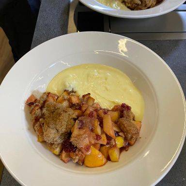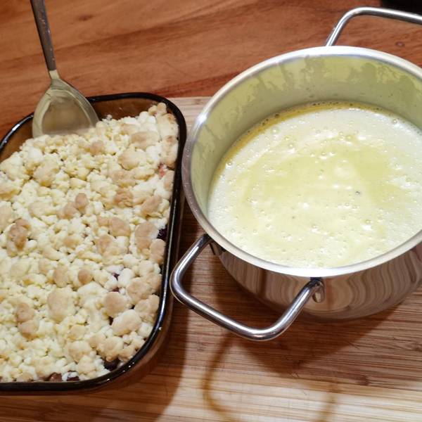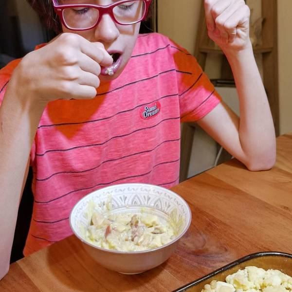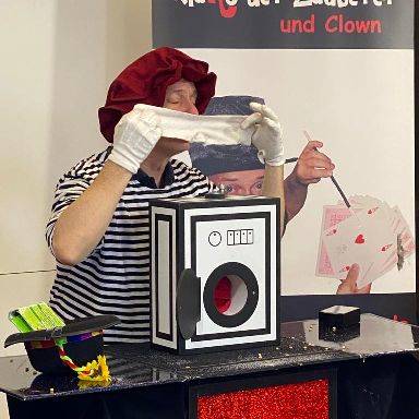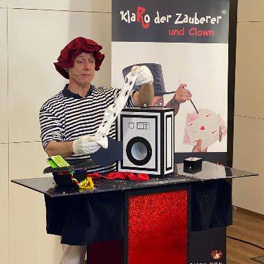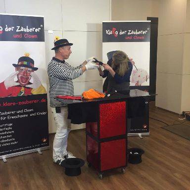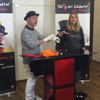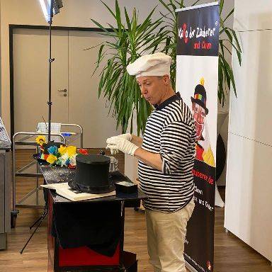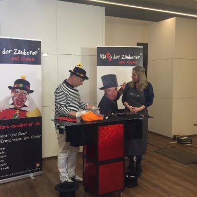 Die Hauptspeise gab es, ein feines mit Cornflakes paniertes Putenschnitzel und ein Sellerieschnitzel für die Vegetarier, dazu gebackene Kartoffeln mit selbstgemachten Kräuterdip. Da blieb sicher kein Krümel auf den Tellern! Doch der krönende Abschluss war die Nachspeise! Apfel-Preiselbeer-Crumble, direkt warm aus dem Ofen mit selbstgemachter Vanillesoße…Mmmm. Apropos Zauberer… Klaro der einzigartige, lustige Zauberer war auch mit von der Partie. Er hat mit seinen Späßen die kleinen und die großen Zuschauer unterhalten. Mit seiner lustigen Art animierte er die Kinder zum Mitmachen und so verging die Pause sehr schnell.